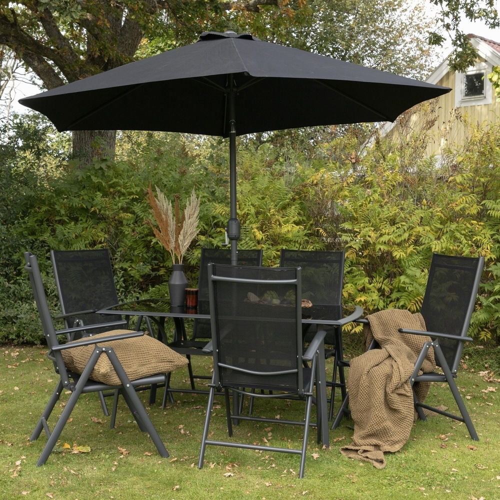 Svalka dig i skuggan ett tag i en modern matgrupp under ett smart parasoll! Matgruppen Brekki bjuder både på ett stilrent matbord emd en bordsskiva i glas och raka ben i svart aluminium. Här tillsammans med fällbara matstolar med en sits i svart textilene och ram aluminium. Parasollet sätts fast i mitten av bordet och är till för att skydda dig från solens varma strålar vid middagsbordet. Parasollet har ett svart tyg med en stomme i aluminium. Det blir inte bättre än såhär!