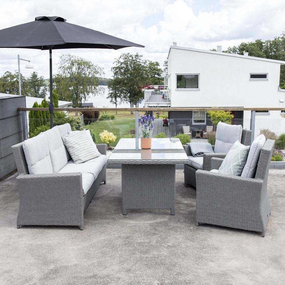 Soffgrupp med en hörnsoffa med ett högre bord till uteplatsen eller altanen inklusive ljusgrå dynor. Soffan och bordet är tillverkad i grå konstrotting och bordet har en bordskiva i glas. Lättare montering krävs.
