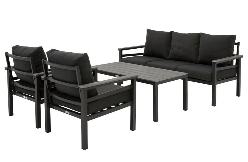 En härlig soffgrupp med en stilren design. Soffan är tillverkad i konstträd, bordsskivan är också av konstträd och underredet är av svart aluminium. Gruppen passar perfekt till uteplatsen och är det lilla extra för att maxa mysfaktorn.