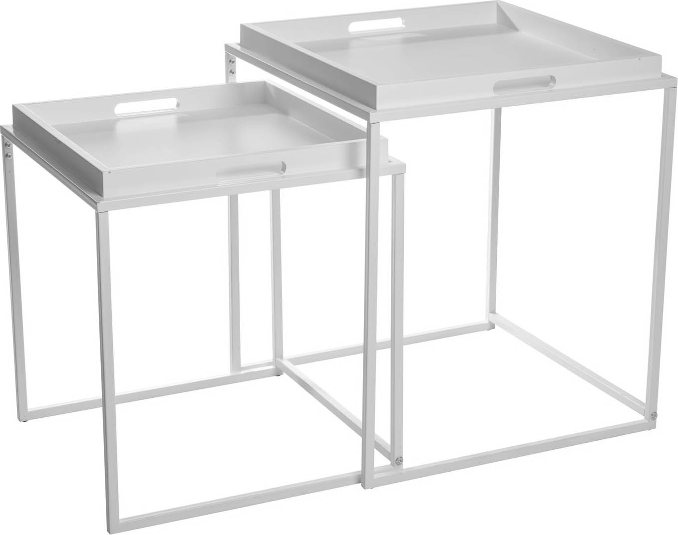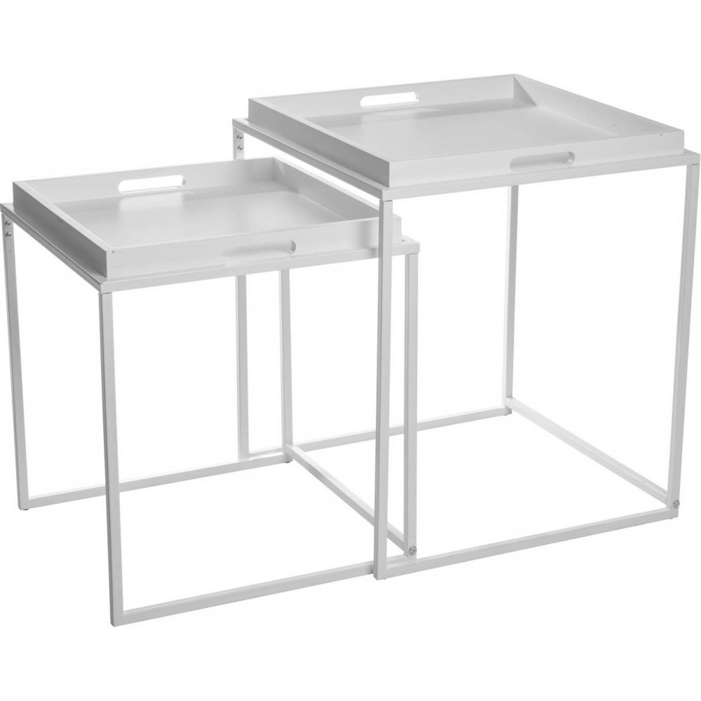 Satsbord bestående av två stycken satsbord med lösa brickor. Underredet är i lackad metall och brickorna i MDF.