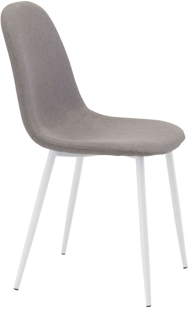 Matstol klädd i grått tyg, 100% polyester. Sits- och rygg är skumstoppade för god komfort. Underrede i vit metall.