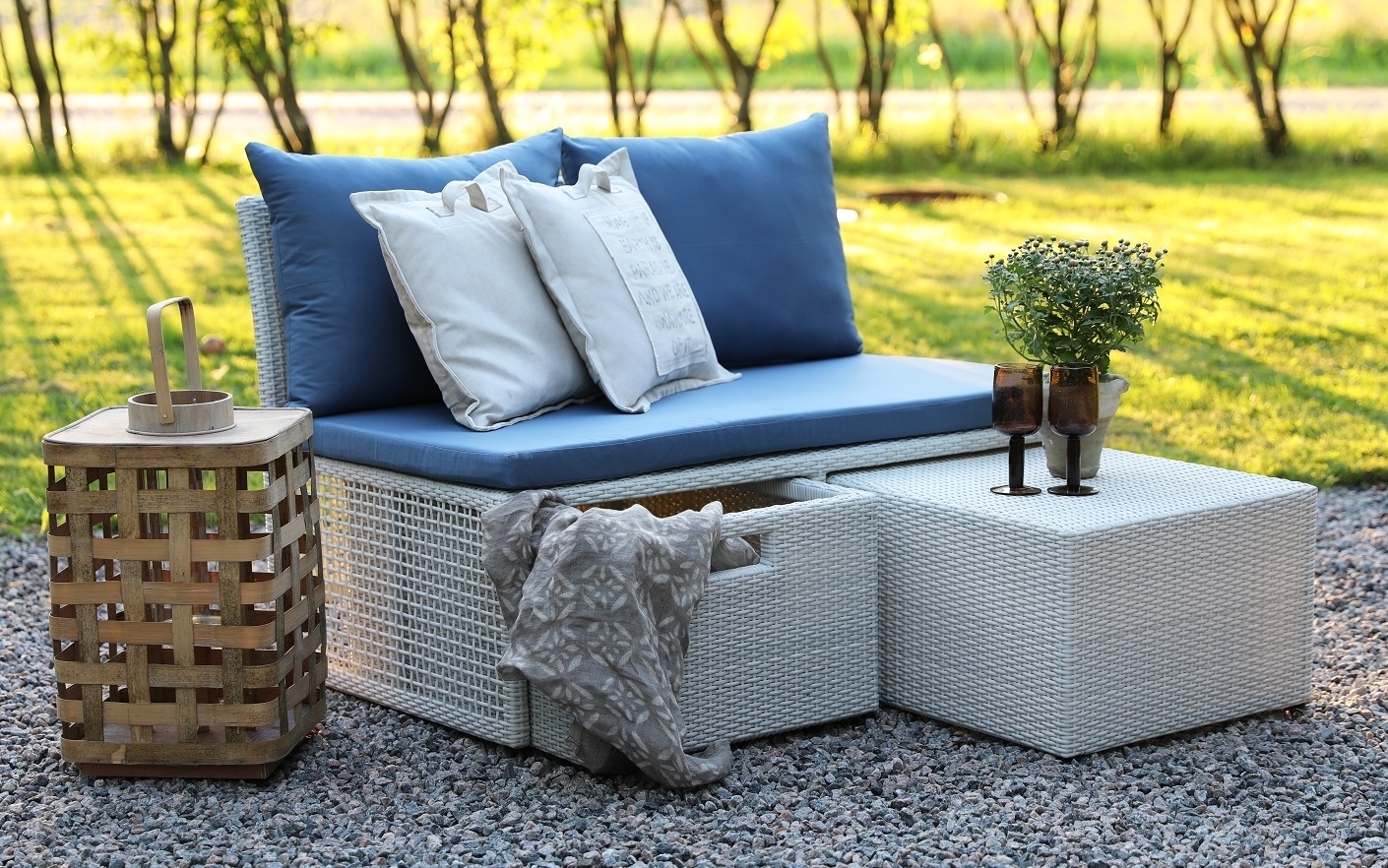 Broby balkongsoffa med sidobord och förvaringskorg är det perfekt alternativet för den lilla uteplasten eller balkongen. Komplett med dynor och fotpall. Ljusgrå konstrotting.