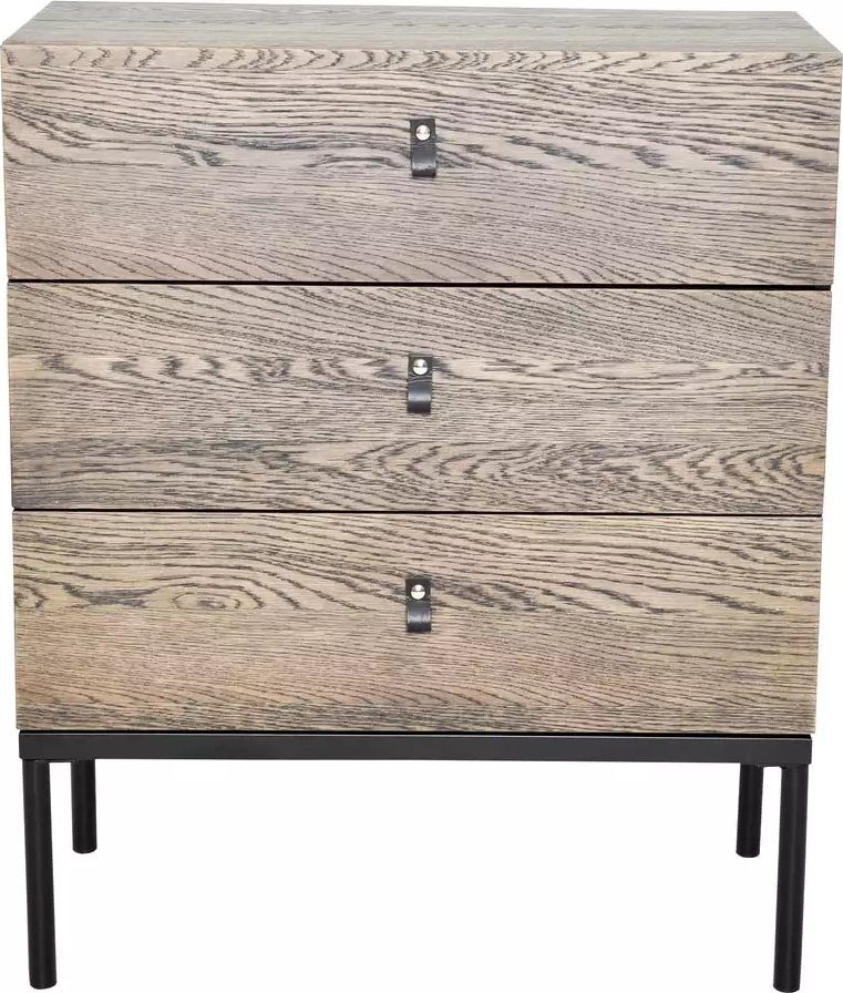 Byrå i brun ekfanér med ben av metall och tre asymmetriska lådor med handtag av konstläder.