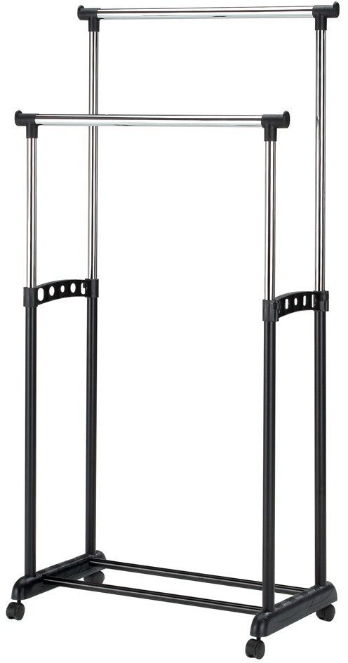 En praktisk klädställning med en stilren design. Ställningen är tillverkad i metall och plast, med praktiskt justerbar höjd och hjul för lätt förflyttning.