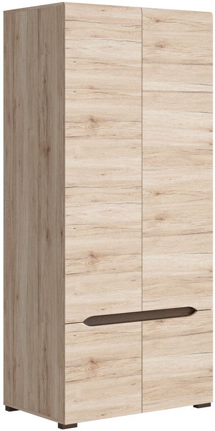 En rymlig garderob i ekimitation. Garderoben har fyra dörrfronter med integrerade handtag. Den är inredd med en praktisk klädstång och hyllor som gör det enkelt att hålla ordning på kläderna.