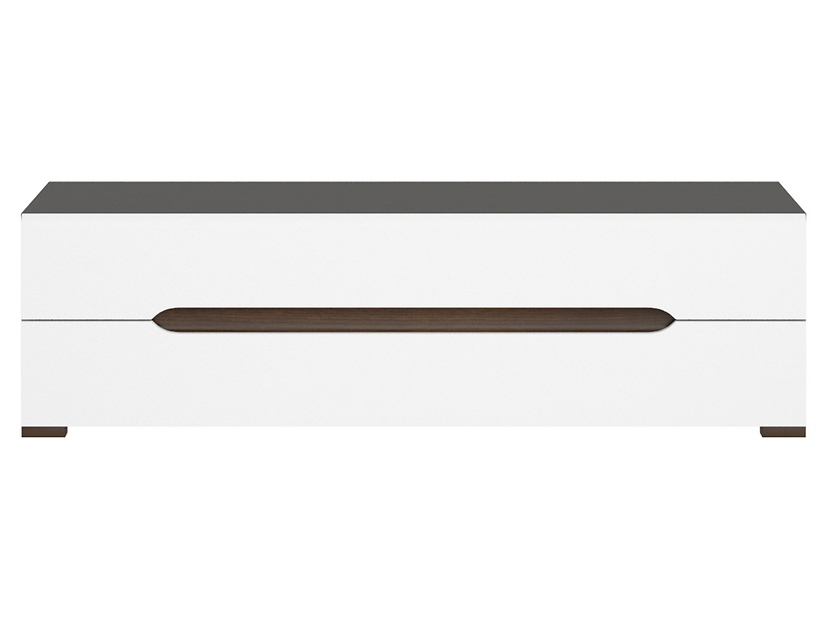 En fin mediabänk i grått med fronter i vitt. Mediabänken har två funktionella lådor med integrerade handtag,