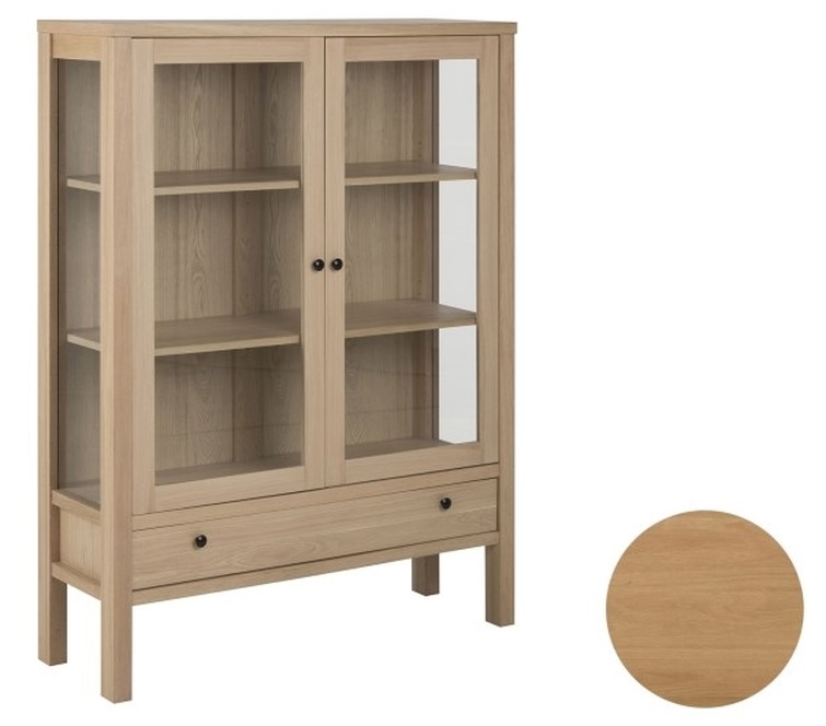 Klassiskt vitrinskåp med två hyllor och en stor låda för förvaring. Gjord av oljebehandlad massiv ek och glas.