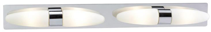 Vägglampa Buffy med en stilren design som är anpassad för badrum. Tillverkad i vitt glas med detaljer i krom. Fast installation (Klass 1). 4x4W fast LED, 4x220 lumen. Energiklass A. Simpel montering av lampan i badrummet.