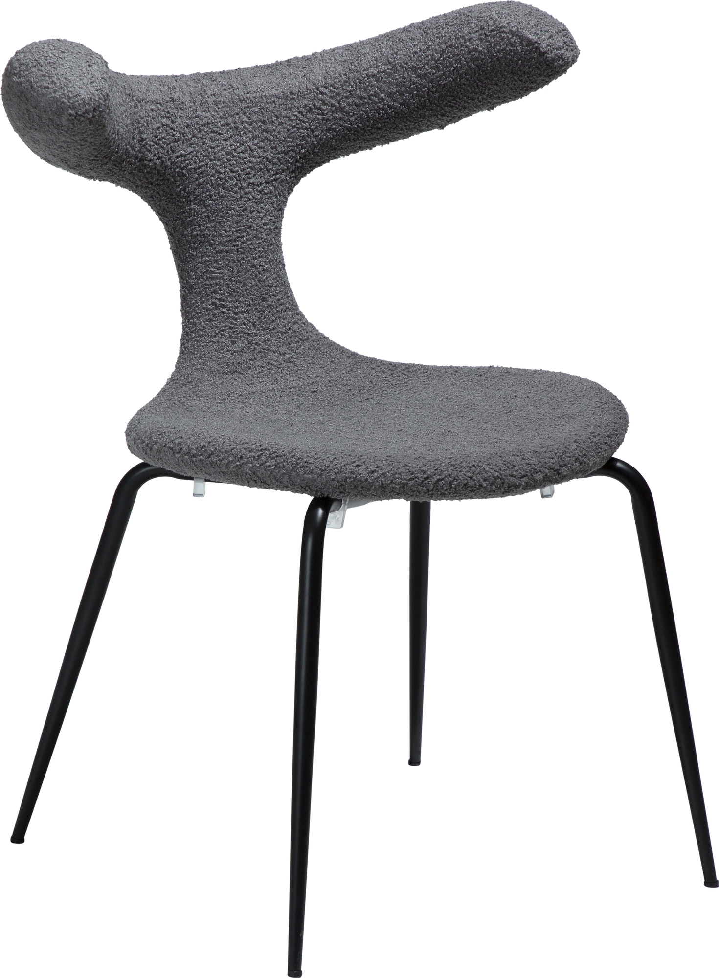 Nätt och stilren matstol från danska Dan-Form. Stolen har en kraftfull men ändå inbjudande look. Ryggen är förlängd på sidorna likt ett tjurhorn. Stommen är tillverkad av metall. Sits och rygg är täckt med bouclétyg av återvunnen plast.
