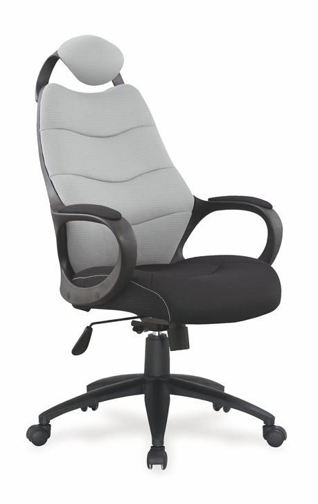 En härligt kontorsstol med en stilren design. Tillverkad i svart metall med detaljer i svart plast, och en mycket behaglig klädsel i svart och grått tyg. Höj- och sänkbar sits med hjälp av spaken under sitsen och lätt att förflytta tack vare hjulen på stjärnfoten.