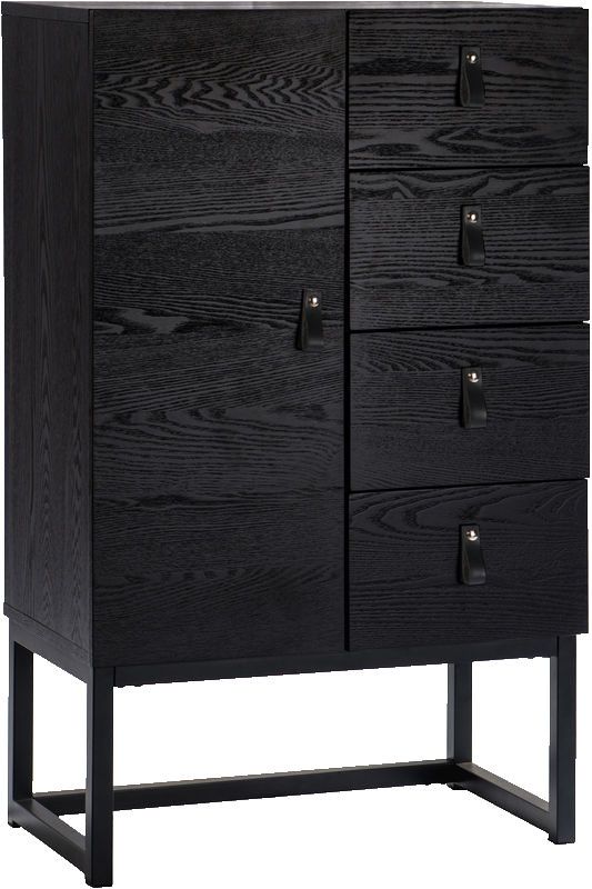 Stiligt skåp i svart askfaner med underrede i svartlackad metall. Skåpet har 4 lådor och 1 dörr. Handtag i svart läder.