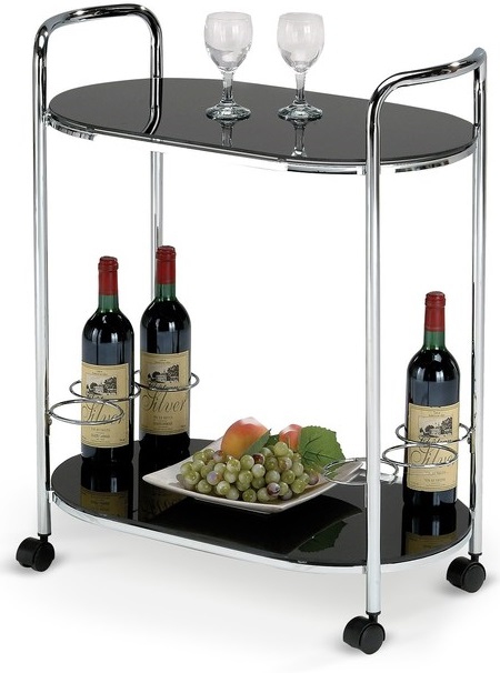 En traditionell serveringsvagn med en modern design. Tillverkad i kromad metall med två bordsskivor i härligt svart glas. Underhyllan har praktiska flaskhållare som håller drinkarna stabila vid förflyttning. Denna serveringsvagnen är avsedd som dekoration och bör max belastas med en vikt på 30kg.