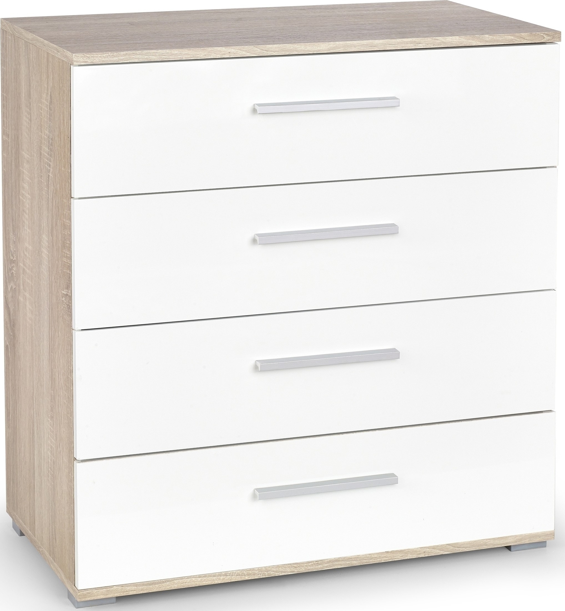En stilren byrå med härlig design. Tillverkad i MFP (premium träskiva) i vitt och ek laminat. Fyra mycket rymliga lådor för praktiskt förvaring. Byrån passar perfekt in på flera olika platser i hushållet.