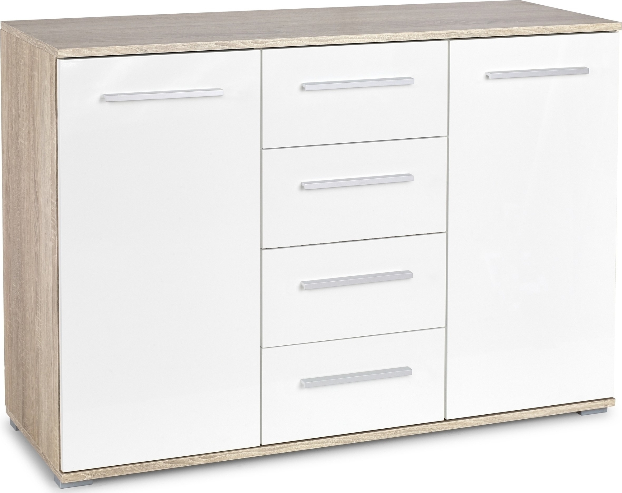 En stilren byrå med härlig design. Tillverkad i MFP (premium träskiva) i vitt och ek laminat. Fyra rymliga lådor och två stora skåp för praktiskt förvaring. Byrån passar perfekt in på flera olika platser i hushållet.
