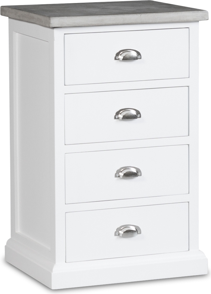 Stilfull byrå i vit mdf med 4 st lådor och toppskiva i microcement. Robust design med toppskiva av ett ytskickt av microcement för att ge känslan av massiv cementskiva.
