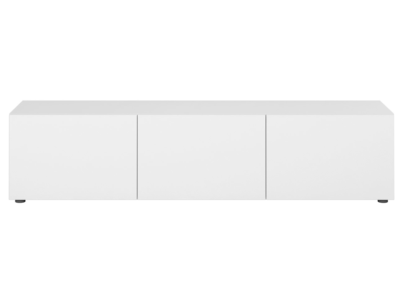 Modern mediabänk i vitt med tre dörrar. Dessa har "push to open" funktion och öppnas med ett tryck. Fronter i PVC.