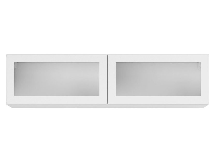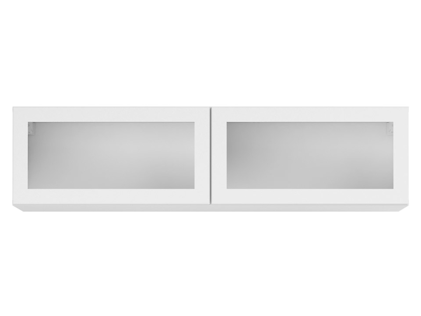 Väggskåp i vitt med fronter i härdat glas. Dessa öppnas utåt i nederkant och har "push to open" funktion, öppnas med ett tryck. Kanter på fronten i PVC.