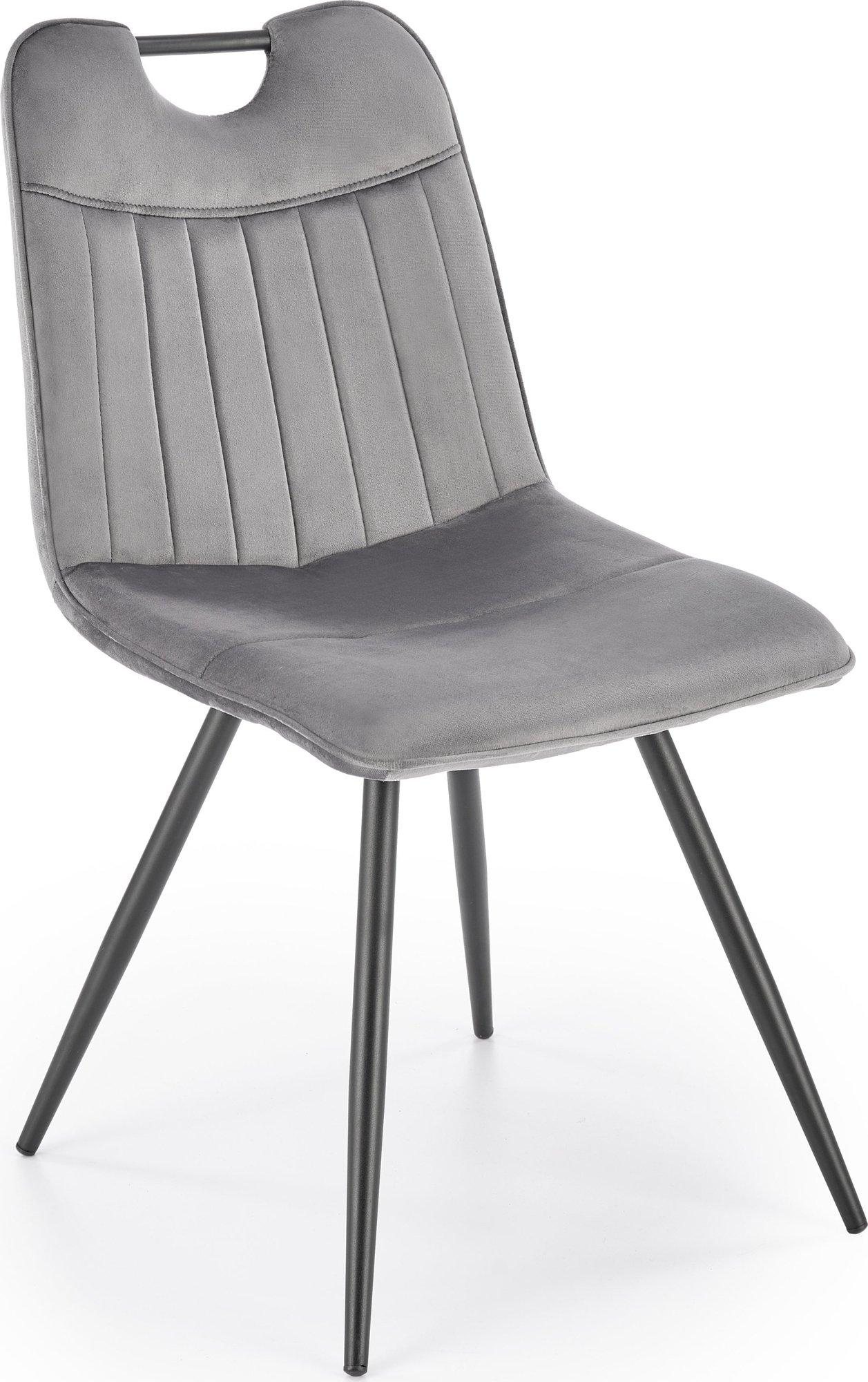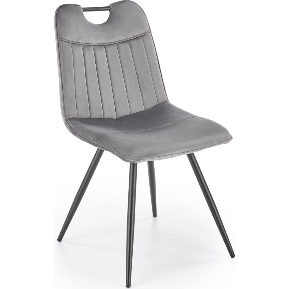 Matstol med underrede av pulverlackerad stål och klädsel av sammetstyg.
