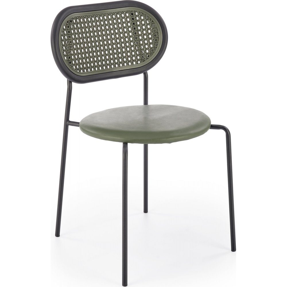 Matstol med underrede av pulverlackerad stål. Sits med klädsel av ekoläder och ryggstöd av konstrotting och polypropen(PP).