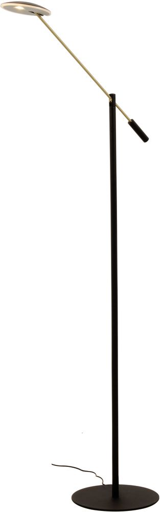 Golvlampa i svart metall med detaljer i matt mässing. Strömbrytare på stommen.