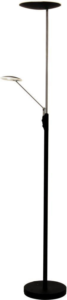 Golvlampa i metall med svart och stål utförande. En takbelysning och en riktbar spotlight. Strömbrytare på stommen.