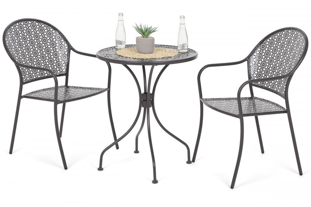 Klassisk cafégrupp med bord och två stolar tillverkade i pulverlackerad stål.