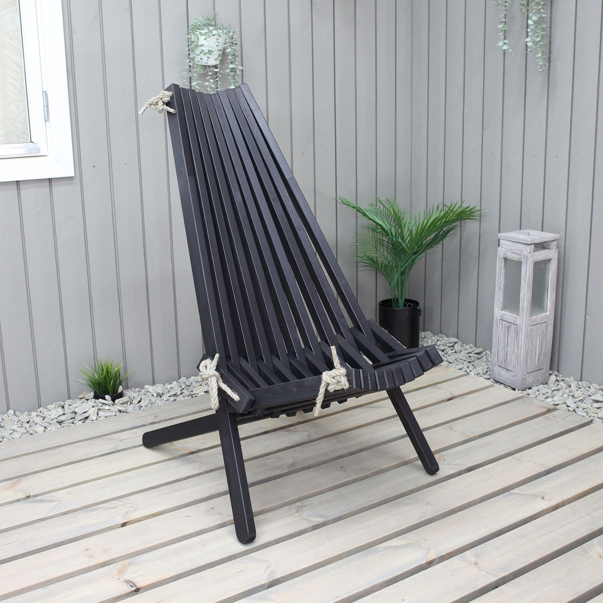 Däckstol i svartbrunt laserad furu. Dess avspända ryggvinkel och breda armstöd ger dig goda förutsättningar att koppla av i sommarvädret. En klassisk och rejäl utemöbel som lätt blir en favorit var den än står.