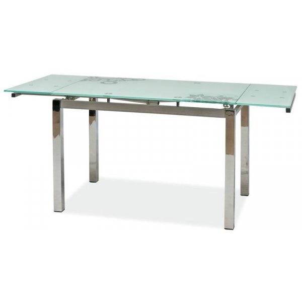Ett snyggt matbord med en modern design. Underredet är tillverkat av kromad metall och bordsskivan är av härdat glas med snyggt tryck. Bordet är praktiskt då du lätt kan förlänga det från 110 cm till 170 cm. Tilläggsskiva ingår.