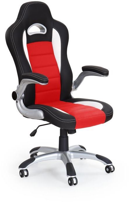 En härligt kontorsstol med en modern design. Tillverkad i metall med detaljer i svart plast, och en mycket behaglig klädsel i svart, vitt och rött konstläder. Höj- och sänkbar sits med hjälp av spaken under sitsen och lätt att förflytta tack vare hjulen på stjärnfoten.