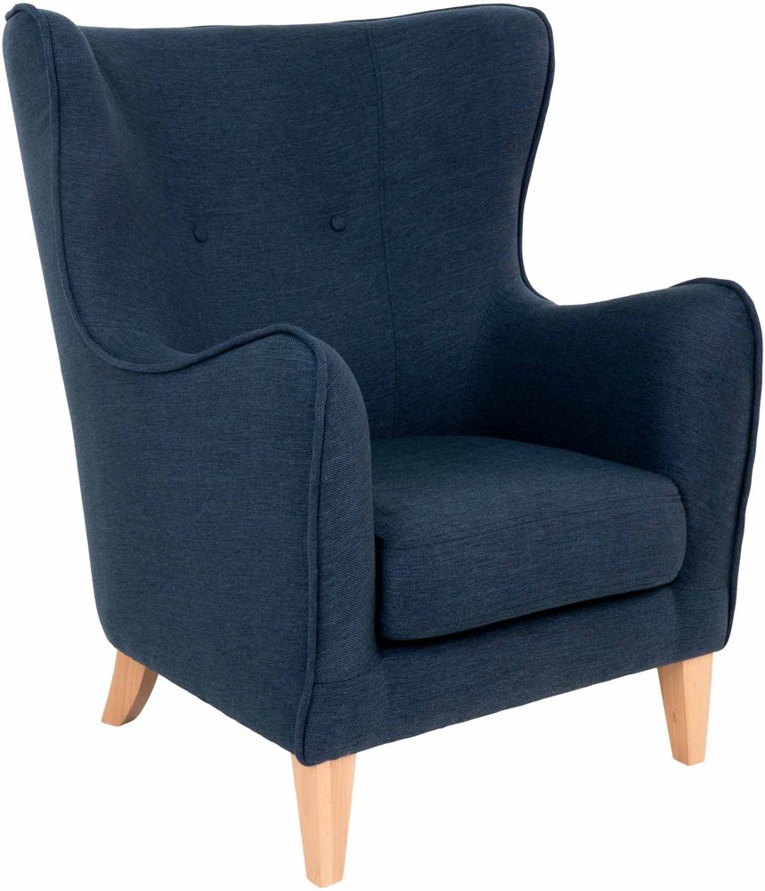 Fåtölj i mörkblått med träben.