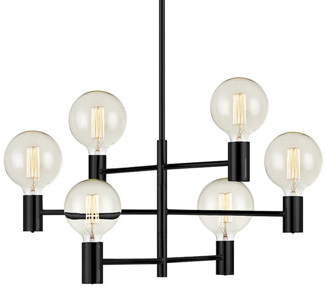 Snygg taklampa med en stilren design. Tillverkad i svart metall med hela 6 lamphållare. Justerbar i höjd samt med vridbara armar. Minsta totalhöjd är 77 cm och max 169 cm. Lampan monteras lätt på plats och passar perfekt in på flera olika platser i hushållet. Stora, (E27) lamphållare för max 60W glödljus eller motsvarande styrka i halogen, lågenergi eller LED. Upphäng för takkrok. Takkontakt klass 1 (Jordad) medföljer.