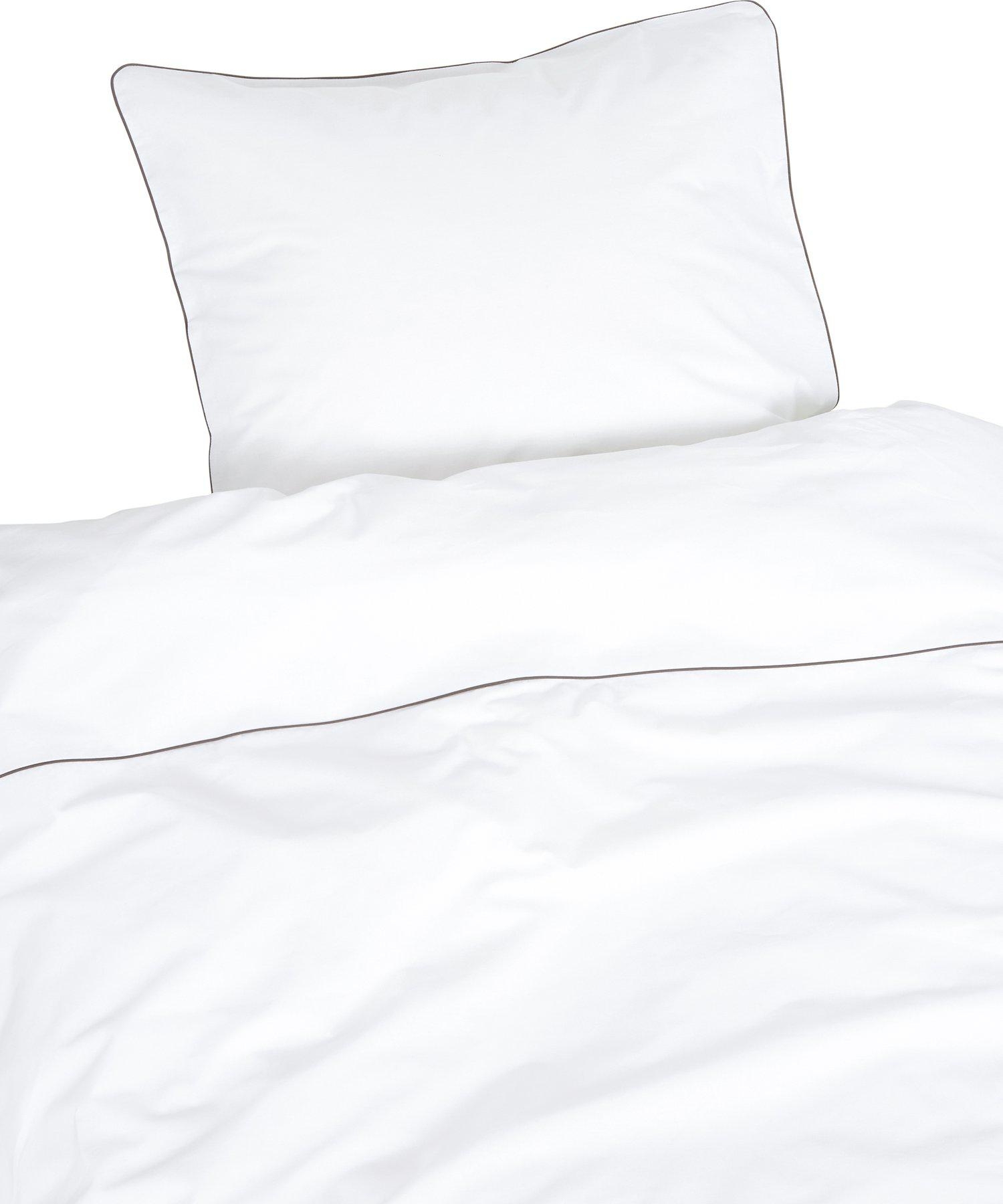 Bäddset Carlton med matchande påslakan och örngott i mjuk bomullspercale, 144 i trådtäthet. Ju högre trådtäthet desto svalare, mjukare och krispigare känsla. Påslakanet stängs med knappar i nederkant och örngottet har en kuvertöppning på ena kortsidan. Påslakan och örngottet har en färgad piping, påslakanet tvärs över bredden upptill och örngottet runt alla fyra sidor. Produkten är certifierad enligt STANDARD 100 by OEKO-TEX®. Certifieringen garanterar att produkten är testad och fri från ämnen som kan vara skadliga för hälsan och miljön.