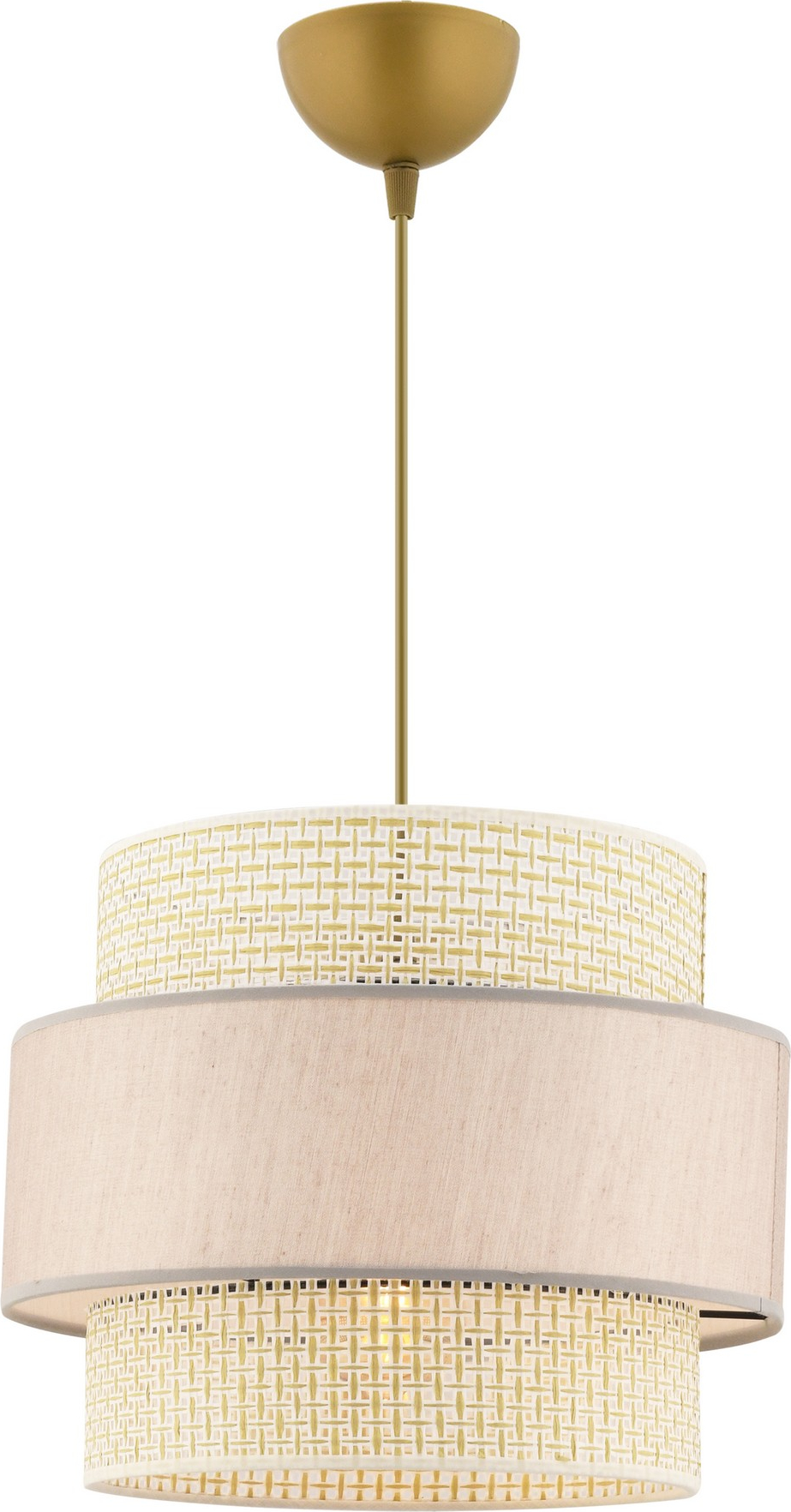 Taklampans metallkropp ger en touch av sofistikering, medan tygskärmen i cream- och beige färger ger en mjuk och mysig känsla till ditt utrymme.