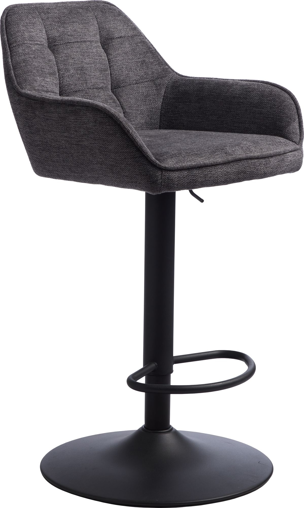 Höj- och sänkbar barstol som kombinerar stil och funktionalitet i en elegant möbel. Barstolen kommer i en sofistikerad mörkgrå nyans med tygklädsel som har ett fyrkantigt mönster. Tyget är särskilt uppskattat för sin lugna och enkla estetik samt sin mjuka känsla. Det är ett slitstarkt material som andas modern nordisk minimalism och är lika praktiskt som stilrent. Barstolens solida svartlackerade metallbas säkerställer både stabilitet och ett modernt, strömlinjeformat utseende.