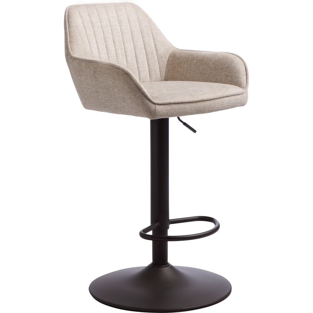 Höj- och sänkbar barstol som kombinerar en diskret elegans med funktionalitet och ger en lugn och raffinerad atmosfär till rummet. Stolens svarta metallben ger inte bara en solid grund, utan också en visuell motpol till den mjuka sandfärgade klädseln. Tyget kännetecknas av ett diagonalt mönster som fördjupar stolens struktur och ger ett subtilt elegant utseende som harmoniserar med stolens enkla linjer och former.