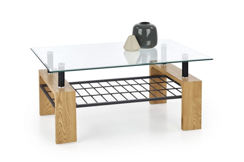 Ett fint soffbord med en modern design. Bordsskivan är tillverkad av mycket tåligt klarglas med en underhylla i pulverlackerad metall och benen är av MFP (premium träskiva) med ett härligt fanér.
