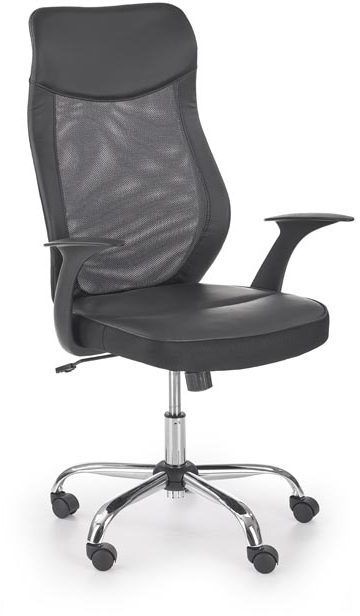 En skön kontorsstol med en stilren design. Tillverkad i kromad metall med detaljer i svart plast och en mycket behaglig klädsel svart konstläder och ryggstöd av nät för maximal komfort. Sitsen är höj- och sänkbar, samt så är stolen lätt flyttbar tack vare hjulen på den kromade stjärnfoten.