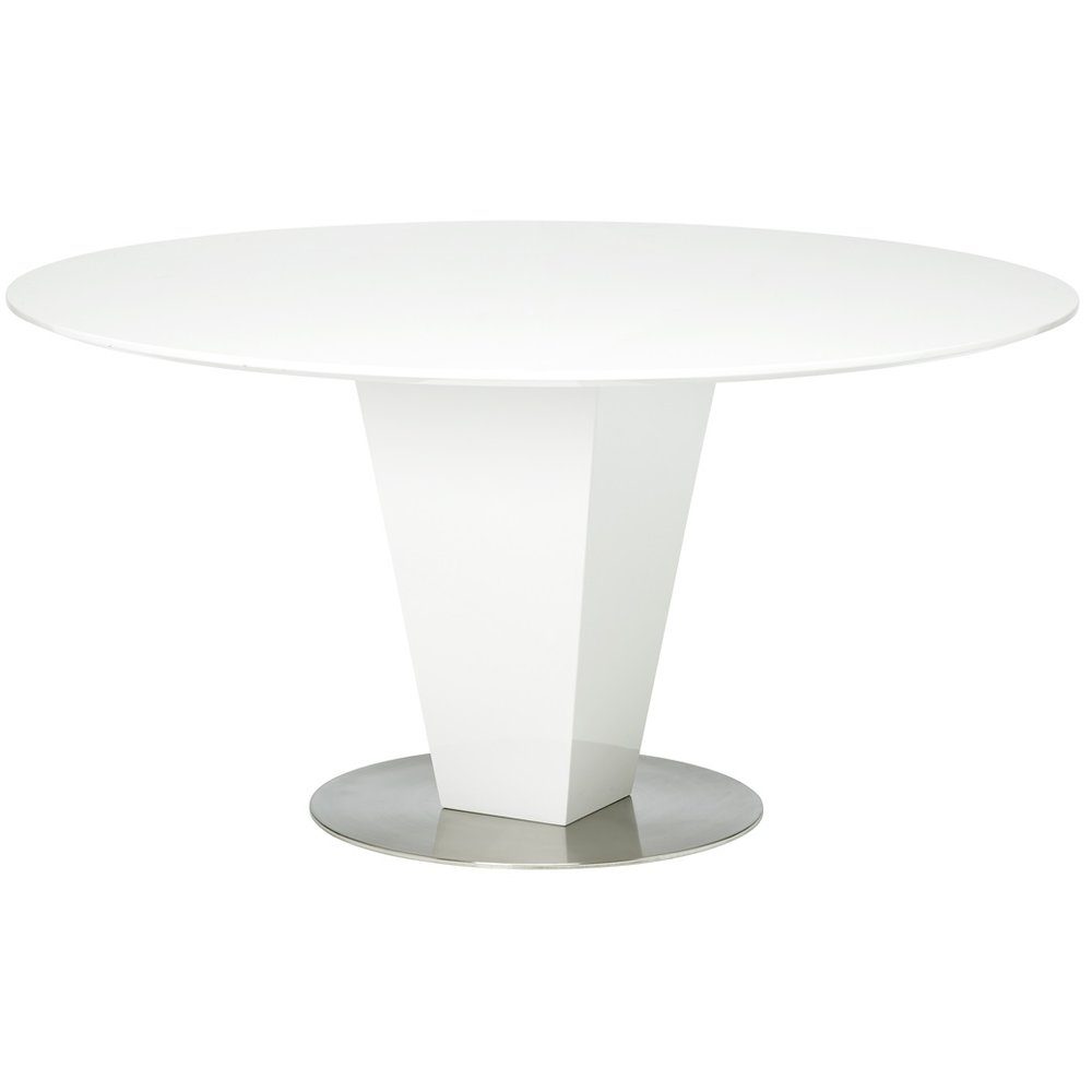 Stilrent och stort runt bord i vit högglans med en fot i borstat rostfritt stål.
