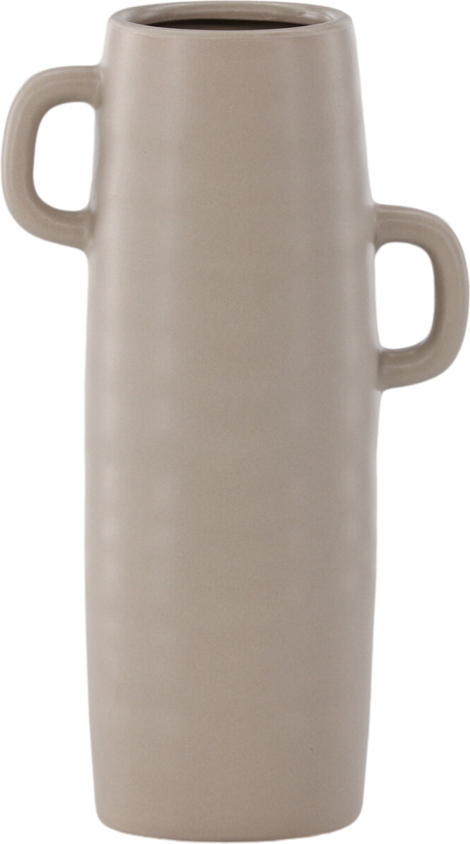 Cent är en sofistikerad och modern vas som kommer att förhöja din inredning på ett unikt sätt. Med sina 22 centimeter i höjd är Cent tillverkad av stengods, vilket ger den en solid och elegant känsla. Den varma ljusbruna färgen gör vasen till en mångsidig pjäs som passar perfekt i alla hem och stilar. Dess unika design inkluderar två handtag på sidorna, placerade i olika höjder för att skapa en konstnärlig asymmetri. Dessa handtag gör det lätt att flytta vasen och ger samtidigt en intressant visuell dimension. Vasens struktur är lite vågig, vilket ger den en distinkt och modern känsla. Den här detaljen skapar en visuell höjdpunkt och ger vasen en unik karaktär som kommer att locka uppmärksamhet. Oavsett om du väljer att placera färska blommor, torkade arrangemang eller helt enkelt låter Cent stå på egen hand, kommer denna vas att bli en imponerande tillskott till ditt hem. Ge ditt rum en touch av elegans och modernitet med Cent - det perfekta sättet att framhäva din personliga stil.
