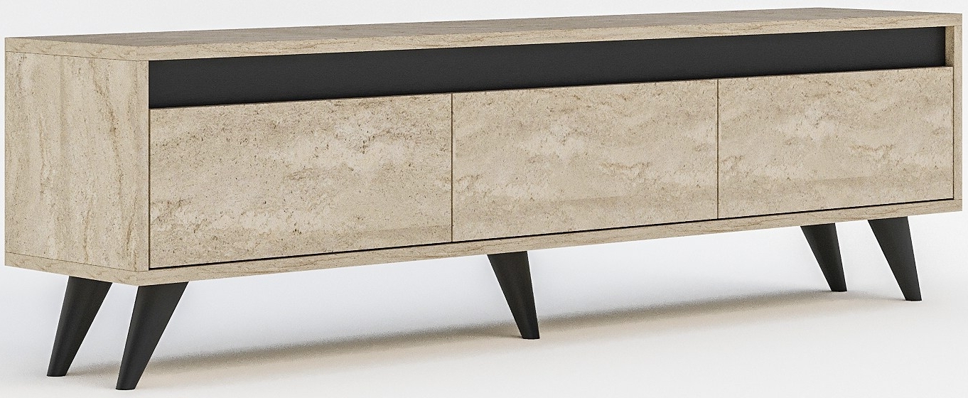 Mediabänk av melaminbelagd spånskiva och ben av plast.