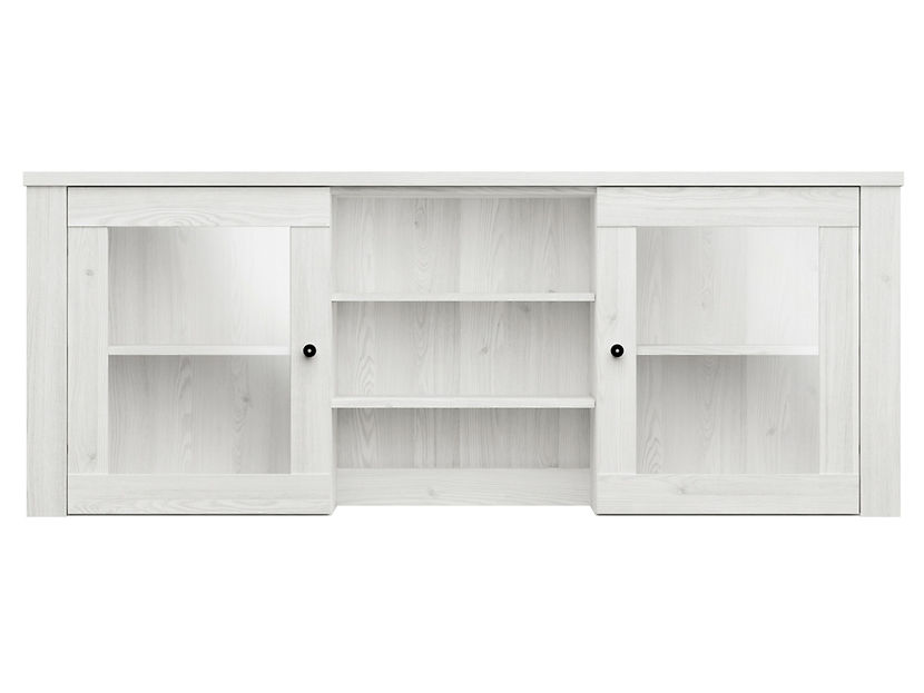 Ett väggskåp i ljus lärk med två glasdörrar och en öppen mittsektion. Skåpet kan med fördel placeras ovanför en byrå eller sideboard från samma möbelserie.