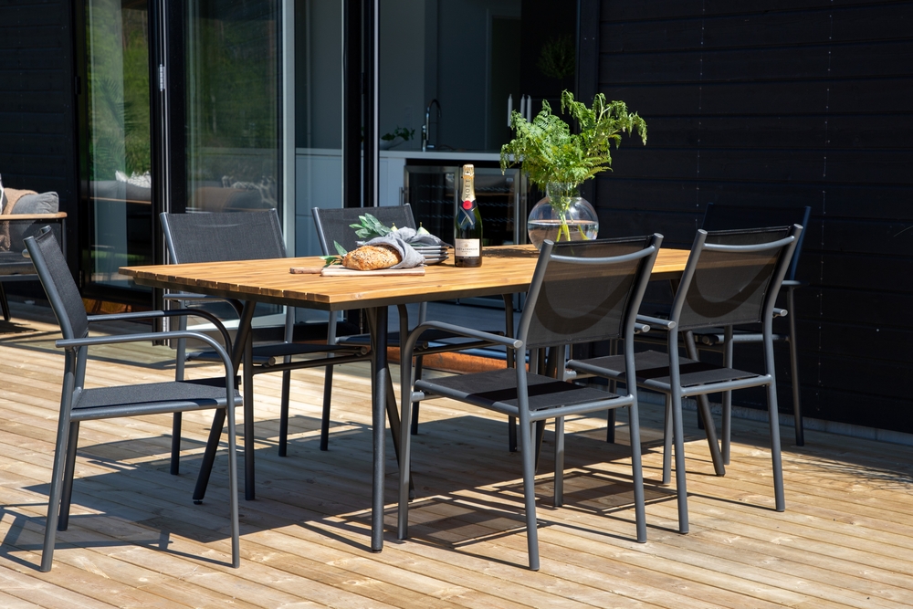 Stilrent, smart och slitstarkt - vad mer kan man önska? Chan är ett naturnära matbord tillverkat i brun akacia med ett underrede i svart stål. Den skandinaviska designen blir iögonfallande med lätt utsvängda ben som blir till en schysst detalj. Bordet passar utmärkt till både fest och vardags så duka ut måltiderna och njut av sena sommarkvällar tillsammans! Skötselråd: För att dina utemöbler i Akacia/hårdträ ska bibehålla sin finish bör de oljebehandlas. Eftersom träslagen i sig inte är lika feta av naturen behöver de oljas lite då och då, även under säsong. Nyinköpta möbler ska mättas med olja, applicera flera lager efter varandra så maximalt med olja absorberas.