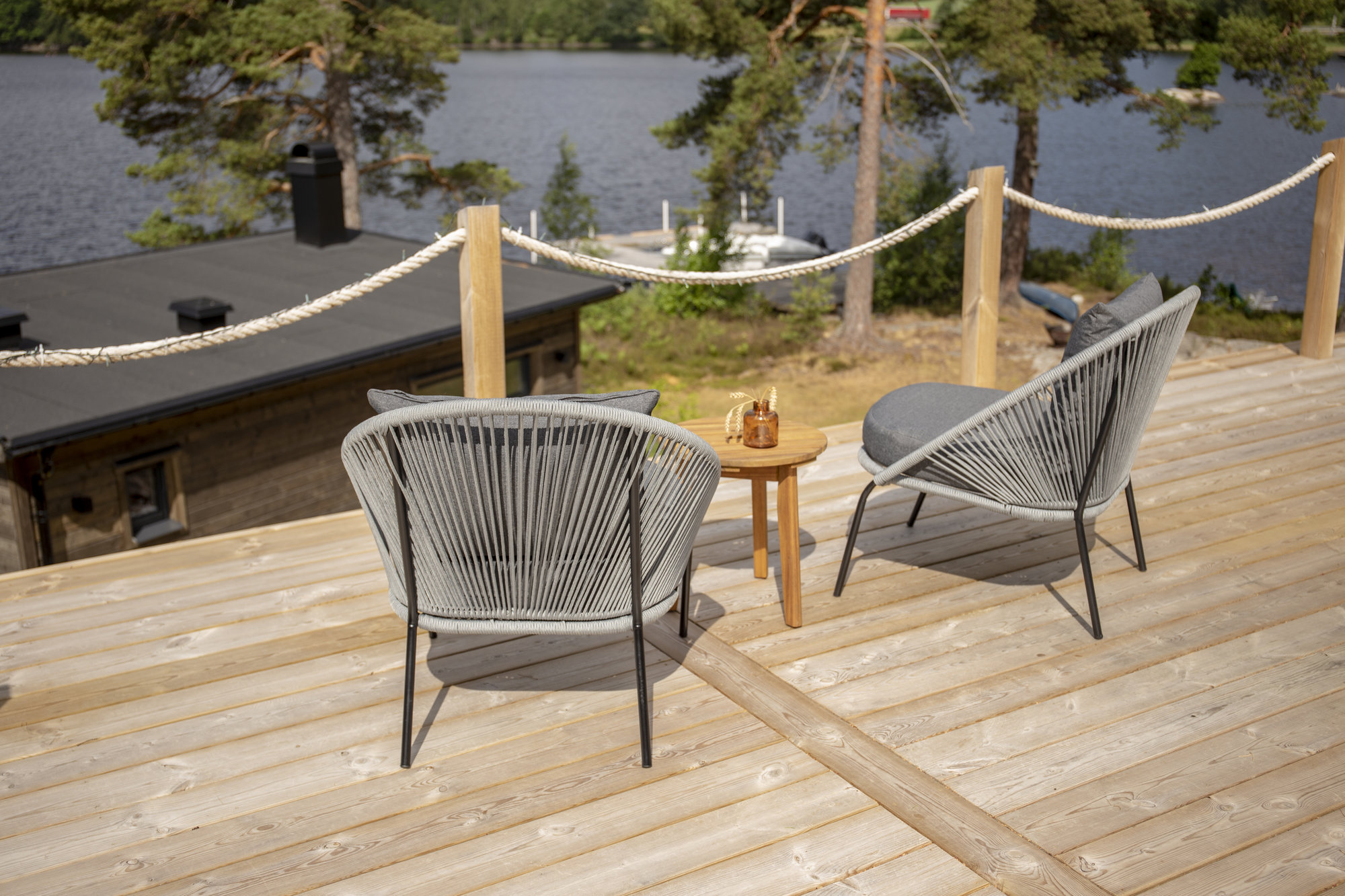 Skapa en inbjudande och avslappnad atmosfär på uteplatsen med Sidobord Chania och Lindos loungestolar. De grå stolarna med vävd rep-sits ger ett stilrent intryck och är perfekta för långvarig avkoppling under sommardagar.