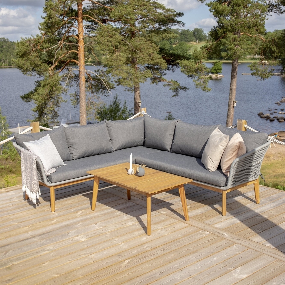 Chania - Trendig modern soffgrupp med fokus på bekvämlighet. Soffgruppen består av en hörnsoffa med fyra sittplatser och en hörndel inklusive tjocka slitstarka mörkgrå dynor. Till soffan ingår även ett lågt soffbord tillverkat helt i akacia. Soffgruppen är tillverkad med en stomme i aluminium med akacia ben samt är rygg och sidor flätade i ett ljusgrått rep som ger en stilren design. Hörnsoffans detaljer i akacia tillsammans med soffbordet skapar en exklusiv helhetskänsla. Skötselråd: För att dina utemöbler i Akacia/hårdträ ska bibehålla sin finish bör de oljebehandlas. Eftersom träslagen i sig inte är lika feta av naturen behöver de oljas lite då och då, även under säsong.