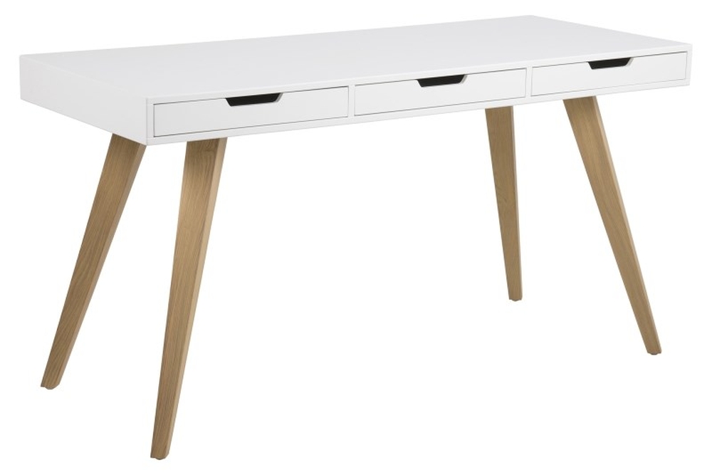 Stilrent skrivbord med tre lådor för smart förvaring. Bordsskivan är målad med vit mattlack och benen är gjorda på fin askträ.