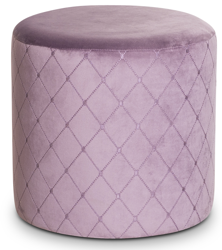 Check cylinderformad sittpuff i ljuslila sammet med ett diamantmönster som en härlig detalj.