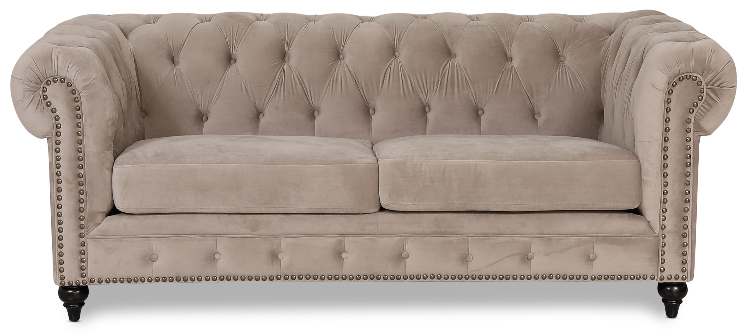 Montgomery chesterfieldsoffa ger dig en högkvalitativ möbel med utsvängande detaljer. Klädd med ett beige sammetstyg. Kopparfärgade nitar i framkant av soffan och svarta ben. Båda sittkuddarna är avtagbara och har pocketfjädrar samt skumstoppning för hög komfort och lång hållbarhet.