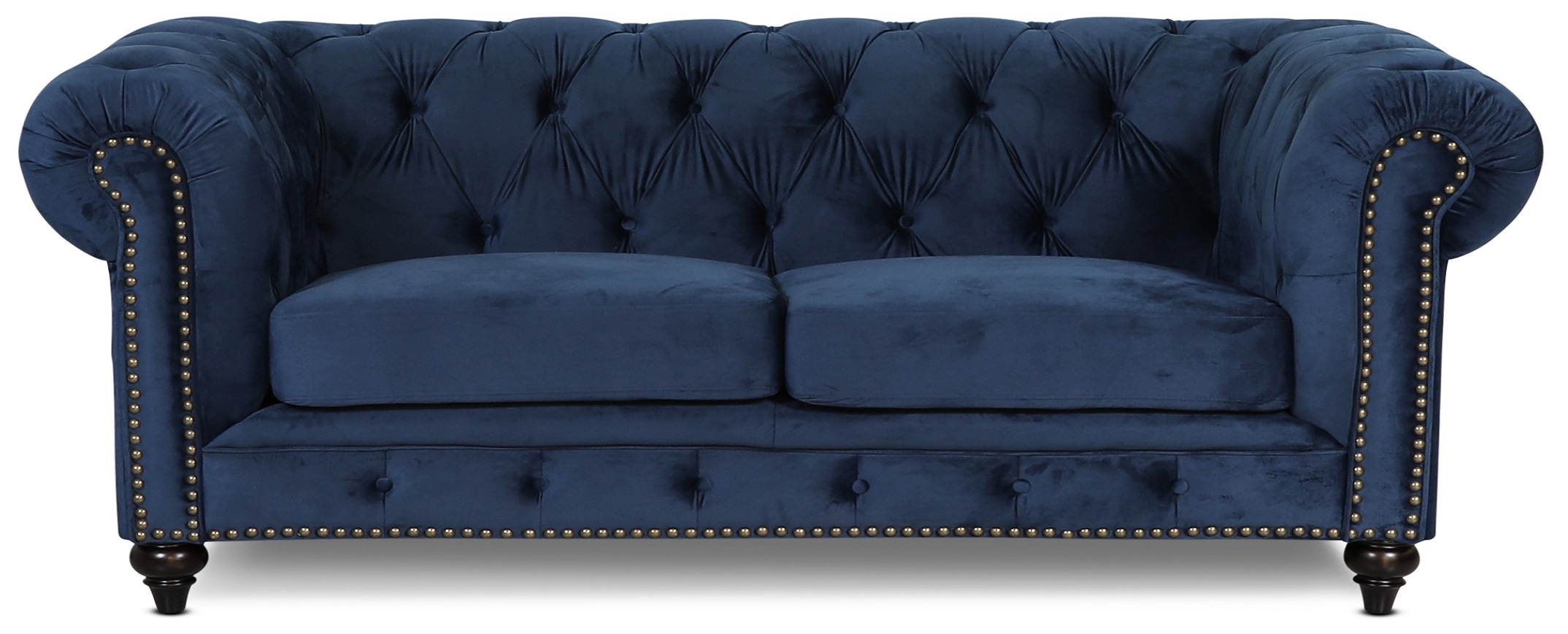 Montgomery chesterfieldsoffa ger dig en högkvalitativ möbel med utsvängande detaljer. Klädd med ett mörkblått sammetstyg. Kopparfärgade nitar i framkant av soffan och svarta ben. Båda sittkuddarna är avtagbara och har pocketfjädrar samt skumstoppning för hög komfort och lång hållbarhet.