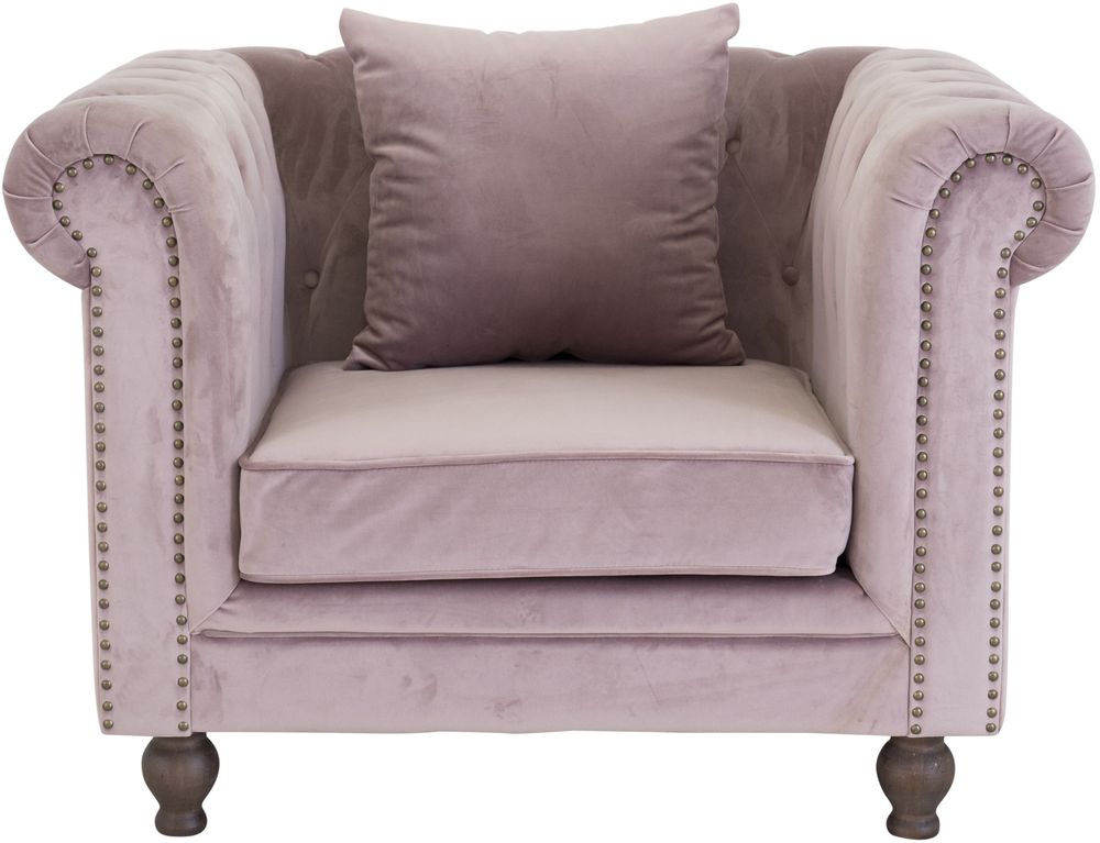 Stilig fåtölj klädd med ett gammalrosa sammetstyg. Dekorativa nitar framtill. Stommen är av massivt trä.