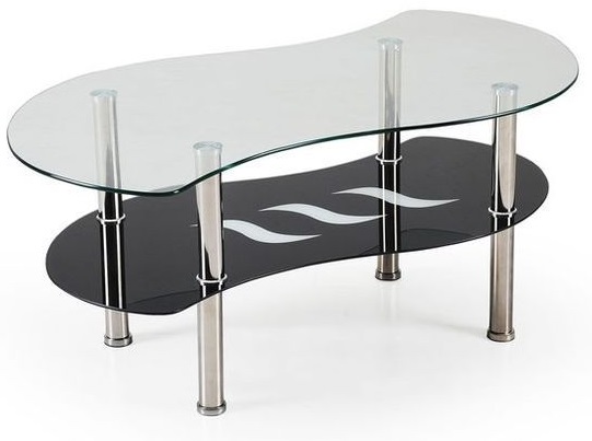 Ett härligt soffbord med en modern design. Underredet är tillverkat i kromad metall och toppskivan är av mycket tåligt klarglas med en praktisk underhylla i svart glas för smart förvaring.